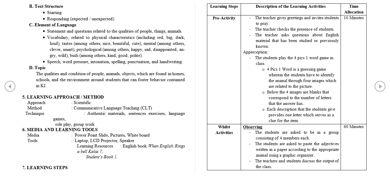 The activity plan starts with the overall scheme of the lesson then is followed by the Core Competencies which adhere to Spiritual Attitude, Social Attitude and Skills such as Reading, Listening, Writing, Speaking. After which, the basic competencies and its indicators follow. To understand it more, here is a copy of the lesson plan for the grade 7 class.
